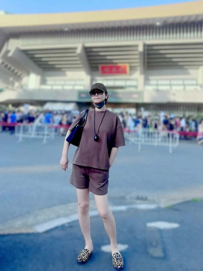 コンサート会場に向かう氷川さんは、ブラウンのTシャツにショートパンツというカジュアルなスタイルで登場。特に目を引いたのは足元のヒョウ柄の靴、帽子とサングラスを身に着け、リラックスした表情でコンサートを楽しむ様子がうかがえます。