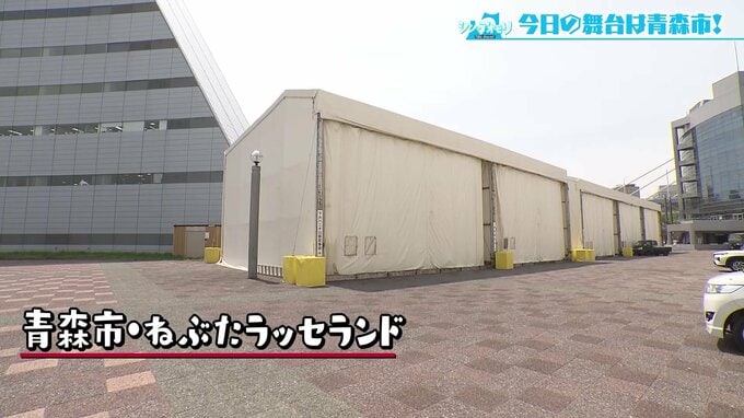 実土里さんがやってきたのは、青森市の観光物産館アスパムに隣接する『ねぶたラッセランド』。毎年春から夏にかけて、青森ねぶた祭に参加する団体が大型ねぶたを制作する仮設の小屋が立ち並びます。