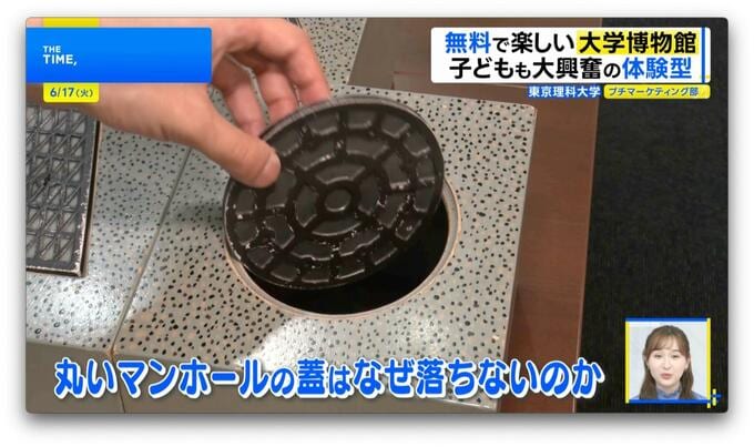 例えば、小さいマンホールのフタが並んだ展示。フタの形は丸だけでなく、四角や台形などもあり、手に取って穴に置いたり差し込んだりしながら<丸いマンホールのフタはなぜ落ちないのか?>を知ることができます。