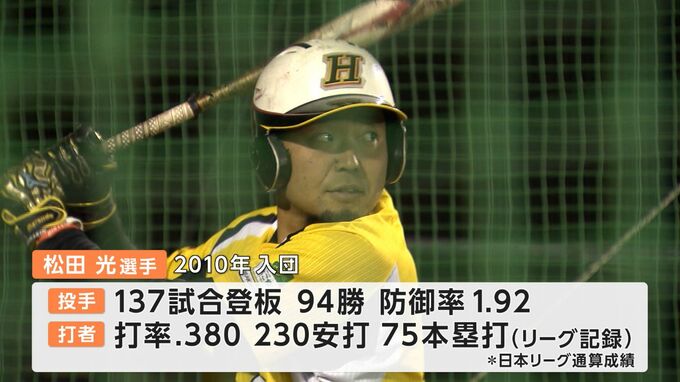 笑顔で引退を語る平林金属の松田光選手。13年に渡ってチームだけでなく日本の男子ソフトボール界の先頭を走ってきました。2010年の入団以来、投手として137試合を投げ防御率1.92、打者としても打率3割8分、ホームラン75本と投打の“リアル二刀流”として前人未到の記録を刻みました。