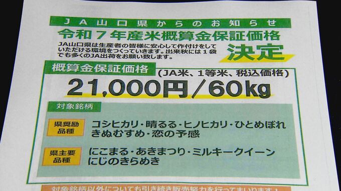 JA山口県はことし生産されたコメについて、集荷する際に農家に前払いする概算金の目安として保証価格を示しました。