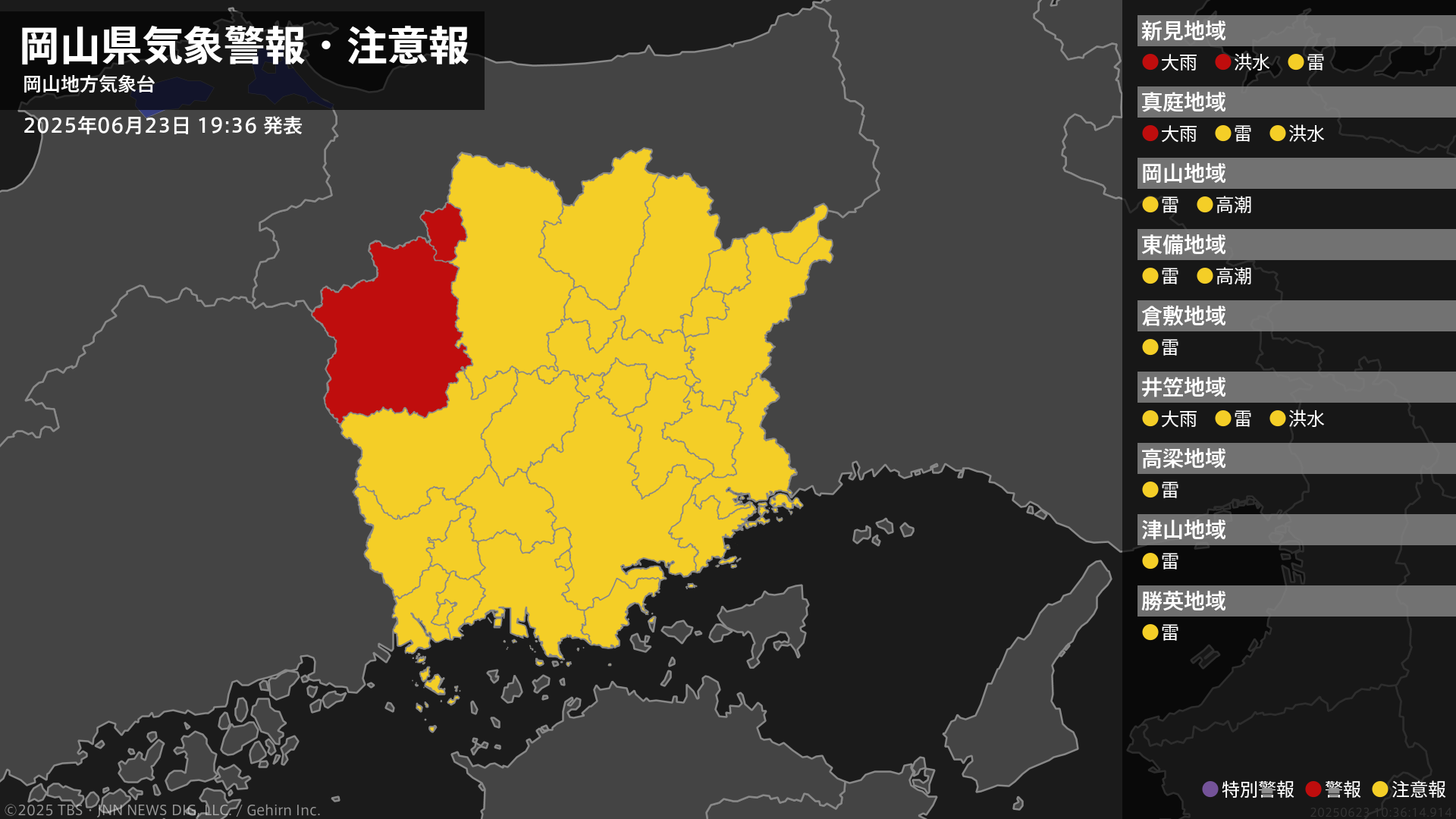 気象台は、午後7時36分に、大雨警報(土砂災害)を新庄村に発表しました。