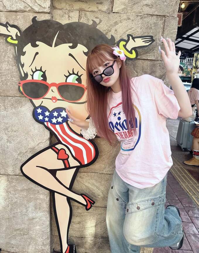 特に印象的なのは、アメリカの国旗模様の衣装を着たベティ・ブープの看板と一緒にポーズを取る写真。黒いサングラスをかけ、片足を上げるという遊び心あふれるショットを披露しています。