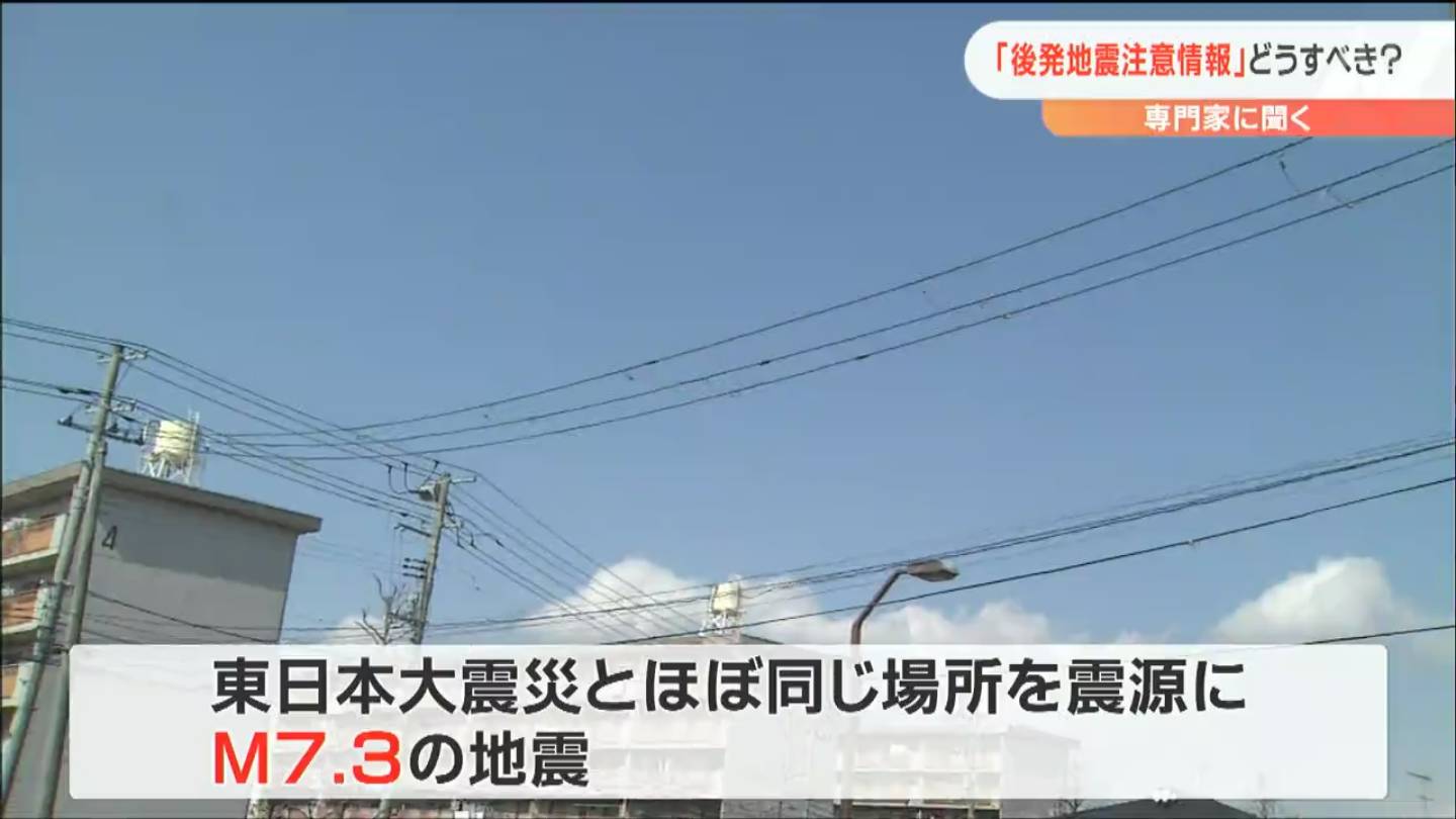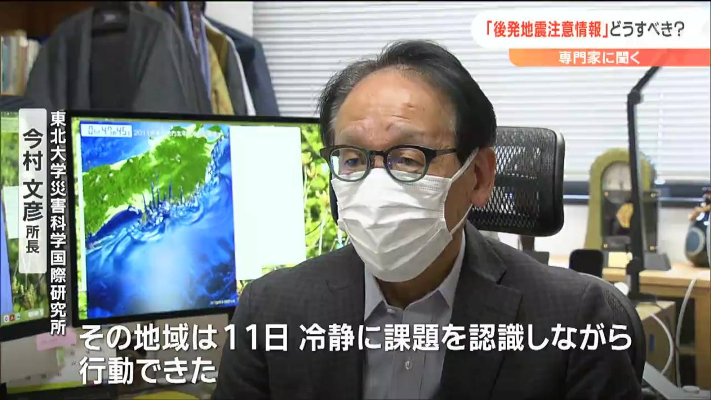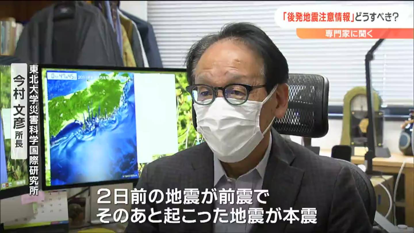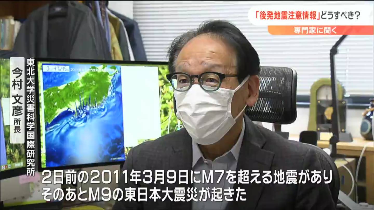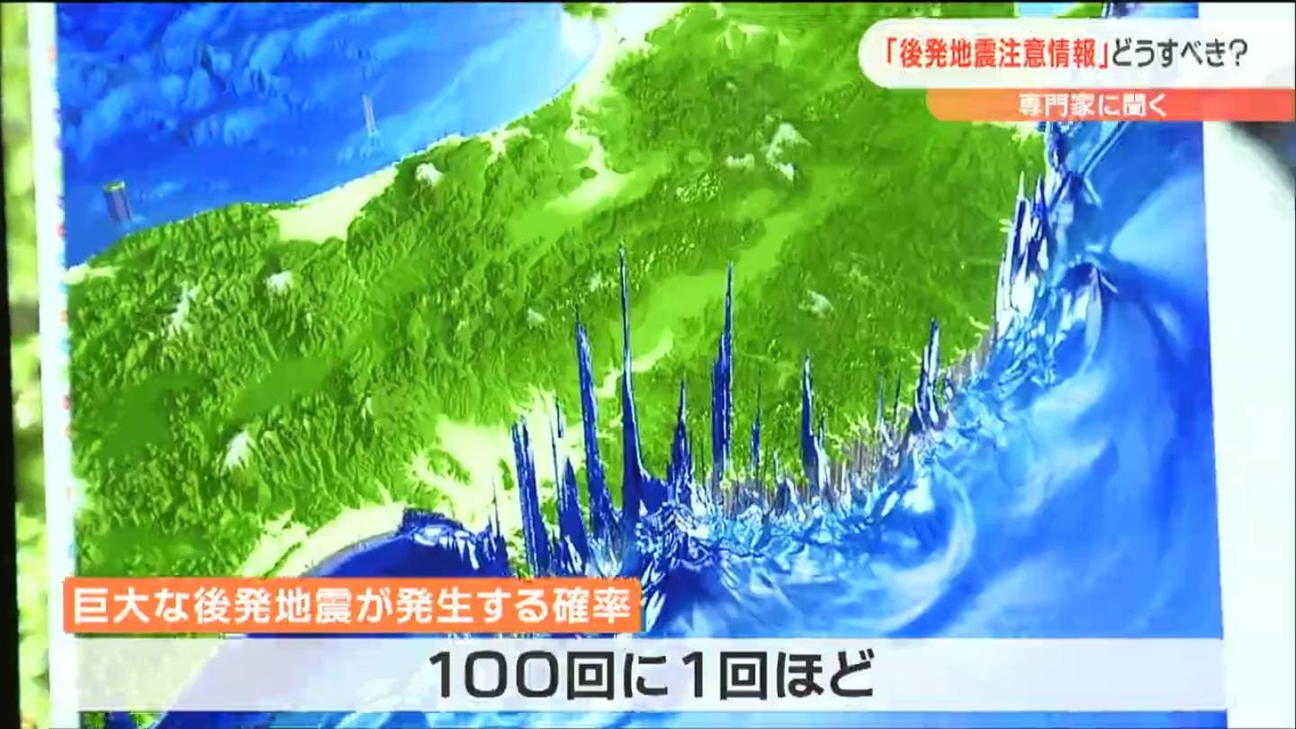 マグニチュード7クラスの地震のあと、さらに巨大な後発地震が発生する確率は、100回に1回ほどですが、発生した場合には甚大な被害が予想されるため、十分注意が必要と話します。