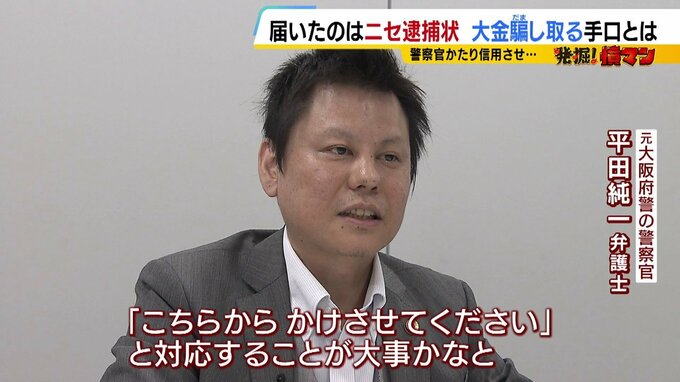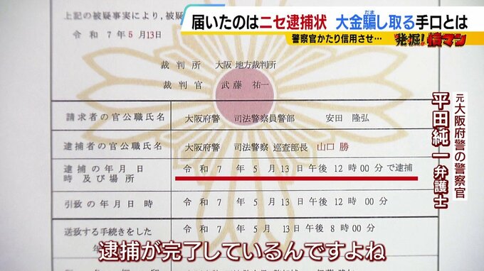 「逮捕が完了しているんですよね。そのあとの検察官への送致も完了していることになっている。そんなことが先に記載している逮捕状があること自体がおかしい」「『警察です』と言われたとしても、『こちらからかけなおしさせてください』と言うことが大事かなと思います」(元警察官の平田純一弁護士)