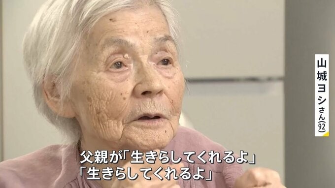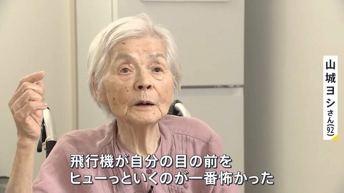 当時、飛行場建設に徴用されていた山城ヨシさん92歳。当時小学6年生でしたが、突然現れた米軍機の恐怖を今でも覚えているといいます。