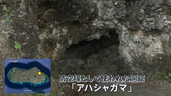 島の北東部にある、防空壕として使われた洞窟「アハシャガマ」。奥行きは20メートルほどですが、約150人が身を寄せ合っていました。