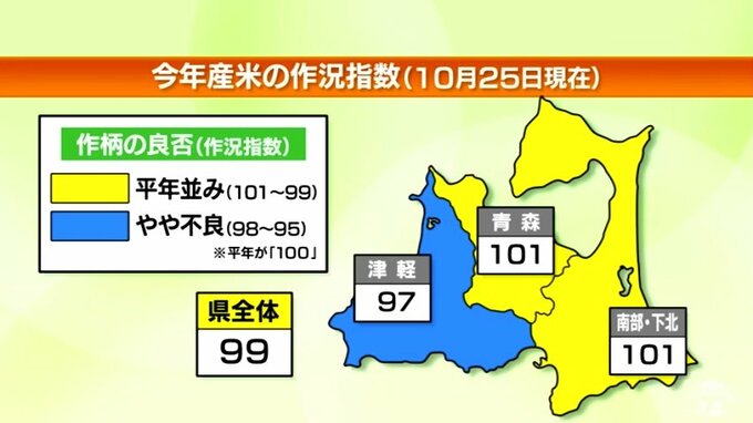 今年2022年産のコメの出来具合をあらわす作況指数は、青森県全体で99の「平年並み」の見通しで、主食用米の予想収穫量は去年を約1万トン下回る20万1400トンと過去最も少なくなりました。東北農政局によりますと、1…