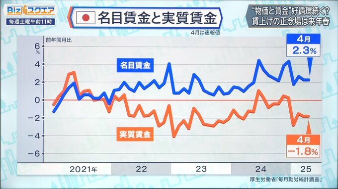 名目賃金は上がっている一方で、実質賃金はマイナスが続いている状況に渡辺さんは、春闘で高い賃上げ水準が出ているものの「物価上昇に見合った賃上げになっていない」と指摘する。