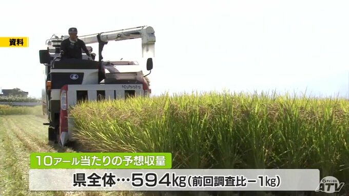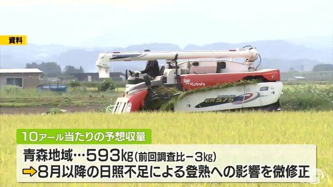 県全体の10アール当たりの予想収量は、前回の調査から1キロ少ない594キロで、特に青森地域では3キロ少ない593キロと、8月以降の日照不足による登熟への影響で前回調査より減少しました。これにより県全体の予想収穫量は20万1400トンで過去最も少なくなりました。