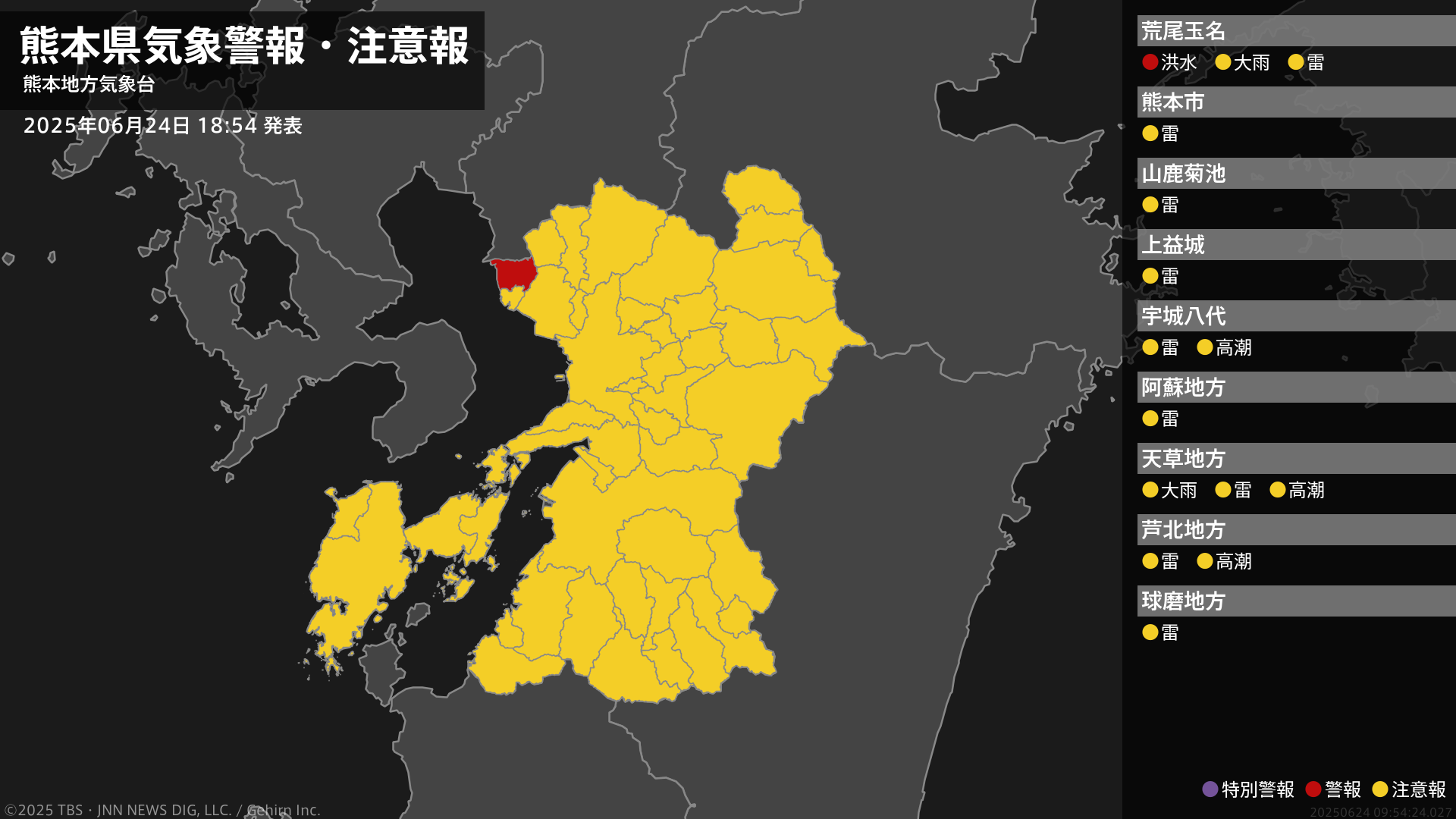 【洪水警報】熊本県・荒尾市に発表 24日18:54時点 TBSテレビ 2025年6月24日(火) 18:54 地震・災害 気象台は、午後6時54分に、洪水警報を荒尾市に発表しました。熊本地方では、24日夜遅くまで河川の増水に警戒してください。【警報(発表中)と予報値】■荒尾市□洪水警報【発表】 24日夜遅くにかけて警戒