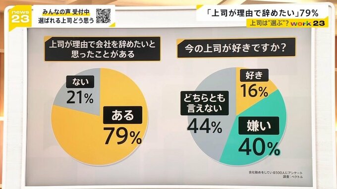 人事コンサルティング会社「ベクトル」が会社勤めをしている500人に行ったアンケートを行ったところ、「上司が理由で会社を辞めたいと思ったことがある」が79%。
