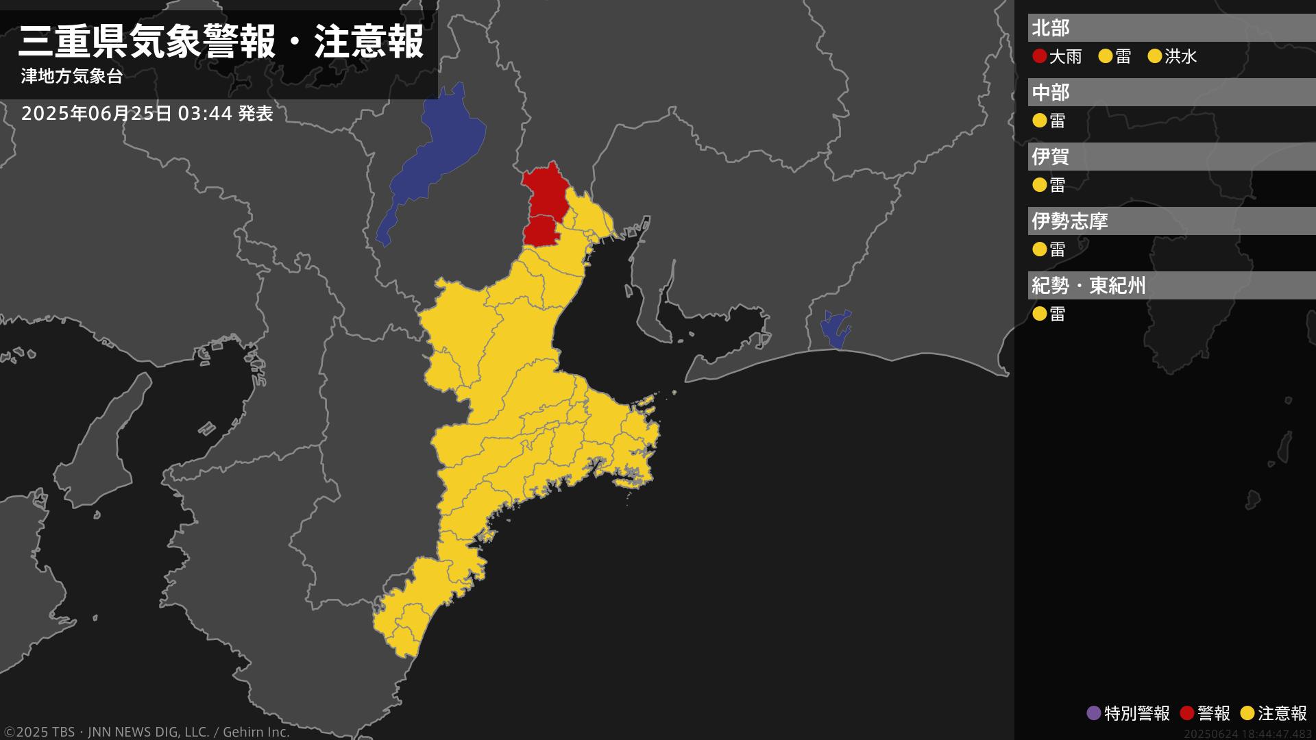 気象台は、午前3時44分に、大雨警報(土砂災害)を菰野町に発表しました。