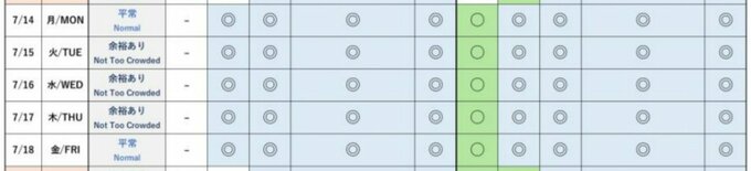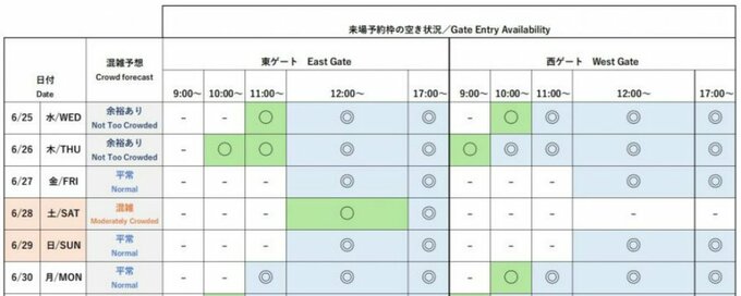 東ゲートのこの先2週間の入場枠の状況です。