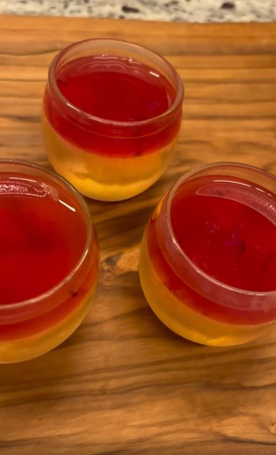 続けて、特に山桃の鮮やかな色合いに着目し、「色が綺麗なので、夏みかんゼリーの上に山桃ゼリー」と、二層のゼリーを考案したことを明かしています。