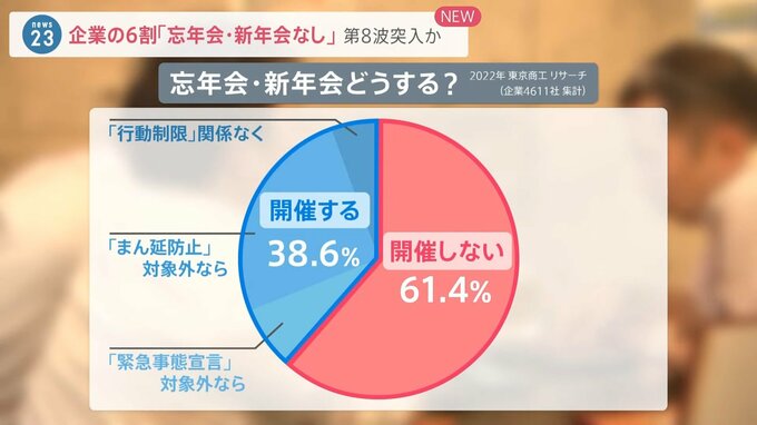 民間の信用調査会社が、全国4611社の企業に忘年会または新年会を開催するか尋ねたところ、条件付きを含め38.6%が「開催する」と回答。
