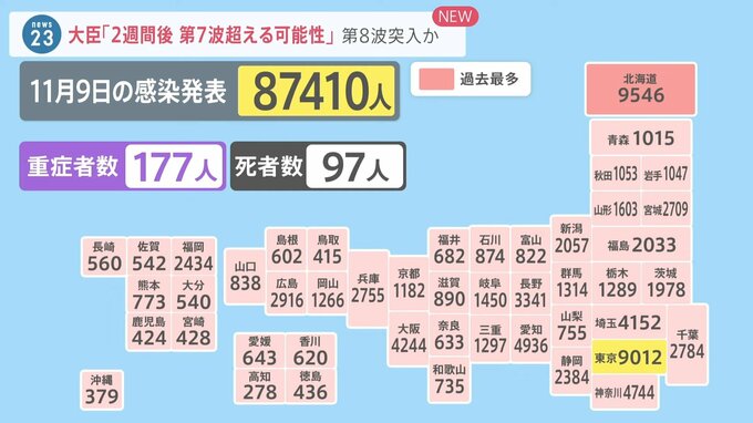 9日、新たに報告された感染者は全国で8万7410人。一週間前(11月2日)と比べ、約1万7000人増えました。北海道は9546人となり、2日連続で過去最多を更新。東京都も9000人(9012人)を超えています。