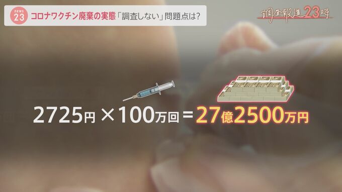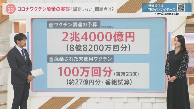 新型コロナのワクチン調達にかかった予算は2022年9月までで2兆4000億円(8億8200万回分・流通費含む)です。私たちの取材では、東京23区だけでも100万回分のワクチンが未使用のまま廃棄されたことがわかっています。これは単純計算で約27億円分です。廃棄の費用もまた税金です。全国で見ればかなりの数が廃棄されているのは確実です。