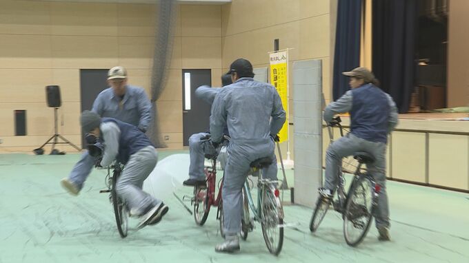 教室ではスタントマンが自動車に見立てたとび箱に自転車でぶつかったり、自転車と歩行者が衝突したりする様子を再現しました。