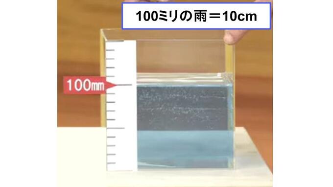 100ミリの雨が降ったということは地面全体が高さ10cmの水たまりになってしまう量の雨が降ったということになります。