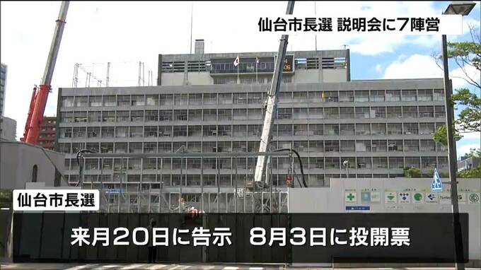 7月20日に告示される仙台市長選挙の立候補予定者を対象とした説明会が26日に開かれ、8つの陣営が出席しました。