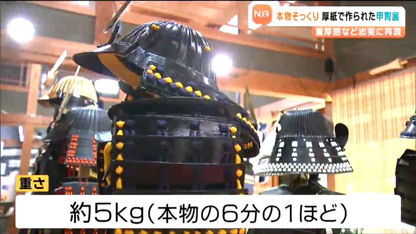甲冑は厚紙を何枚も貼り合わせた上、塗料を塗り重ねて光沢や重厚感が忠実に再現されていて、重さは約5キロで本物の6分の1ほどです。いずれも戦国時代の武将が使った甲冑そっくりに仕上がっています。