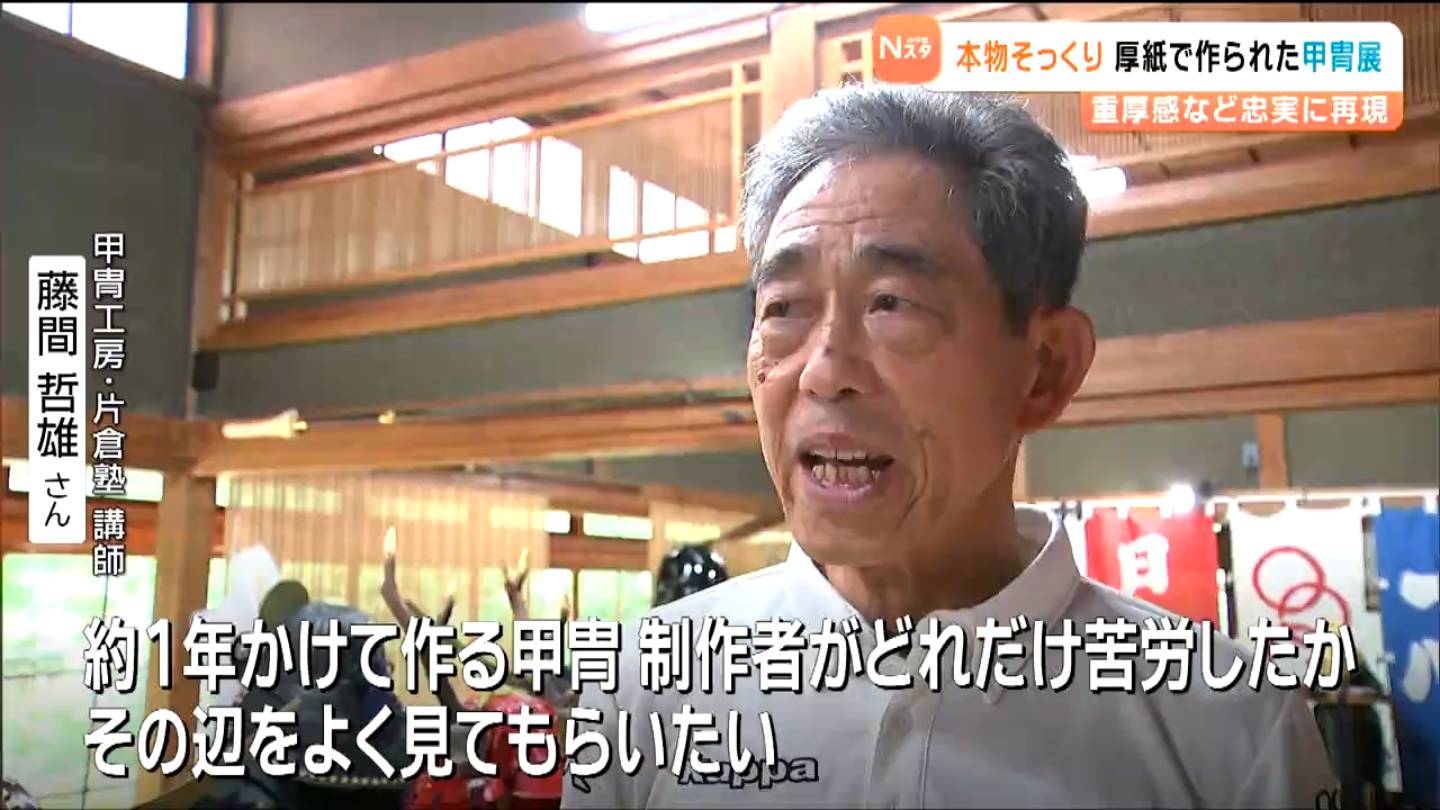 「約1年かけて作る甲冑です。制作者がどれだけ苦労したか、その辺をよく見てもらいたい。平らな紙から作るので立体感を出すのにたいへん苦労しているので、その辺をよく見てほしい」