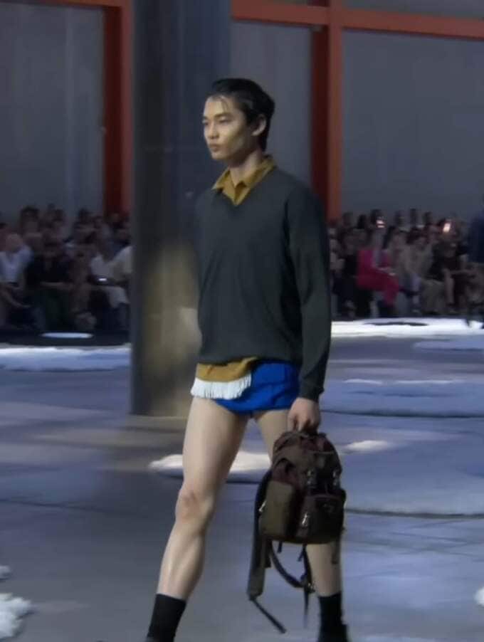 続いて、サマーニットとシャツを重ね着し、超ミニのショーツからの素脚に黒のソックスとレザーシューズという、シャープな夏の装いで颯爽とランウェイを行く自身の写真を投稿。「初海外ランウェイがこれか!」「アツ!」と、メジャーかつハイブランドで自らの海外初舞台をつかんだことを明かしています。