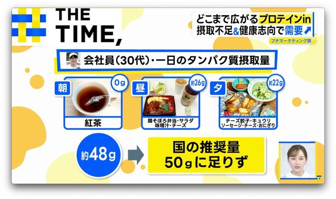 「プロテイン(たんぱく質)は『筋肉を鍛えるために取るもの』というイメージが先行しがちですが、たんぱく質は“体の全てを構成する原料”になる。食事量が少ない人、3食ちゃんと食べない人は、たんぱく質が足りていない食事になっている可能性がある」