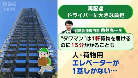 専門家によると、タワーマンションでは、荷物用のエレベーターが1基しかなく、他の業者と重なると長時間待たされる、などといった構造的な問題もあり、対面で1軒に荷物を届けるだけで15分かかるケースもあるそうです。