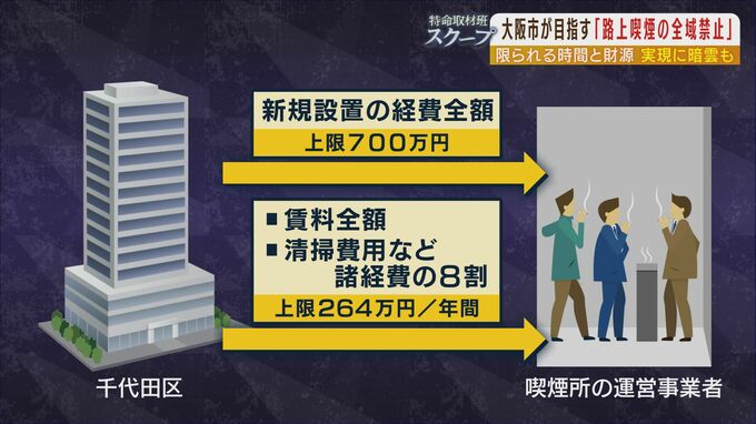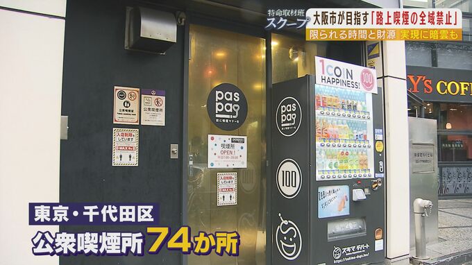「1400万円の喫煙所」あっても外で吸う人が...2025年万博で『大阪市内全域の路上喫煙禁止』は可能?東京・千代田区の経験から見えるハードル 毎日放送 2022年11月10日(木) 14:32 経済 暮らし・マネー 区内全域禁煙の東京都千代田区…喫煙所の9割超を民間が運営 その整備方法について大阪市が参考にしている都市がある。官公庁や多くの企業がオフィスを構える東京都千代田区だ。 (東京都千代田区・地域振興部安全生活課 乙部冬子さん) 「(Q千代田区での路上喫煙は?)現在は皇居を除く全域が禁煙になっています」 千代田区では、2002年に一部区域で路上喫煙を禁止したのを皮切りに約7年かけて範囲を広げ、2010年には区内全域を禁煙にした。 (東京都千代田区・地域振興部安全生活課 乙部冬子さん) 「(Q今いる場所は大きな交差点ですが?)吸い終わったらペッと(捨てて)行っちゃうのが当たり前だったのが20年前。この辺もずっと吸い殻だらけでした」 千代田区には公衆の喫煙所が現在74か所あるが、実はその9割以上は区が民間にお金を出して運営してもらっている。 喫煙所を整備する初期費用については700万円を上限に区が全額を補助。さらに年間264万円を上限にテナント賃料の全額と清掃費用など諸経費の8割を負担している。