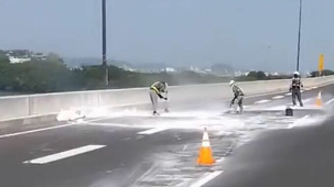 こちらは今年7月に岡山県倉敷市の国道2号で積み荷の石灰が散乱した時の状況【画像①】です。