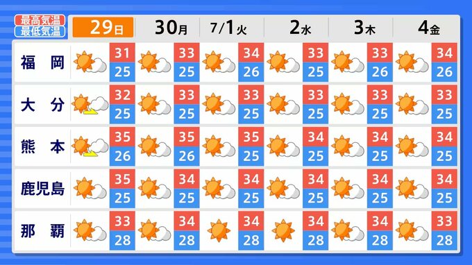 日本列島が“真っ赤”に染まる… 全国で7月2日から“10年に一度”レベルの「かなりの高温」の可能性 来週は東日本~西日本で1週間くまなく予想最高気温が『30℃超』【週間天気・気象庁の全般気象情報あり】 青森テレビ 2025年6月27日(金) 19:20 国内 九州の週間天気