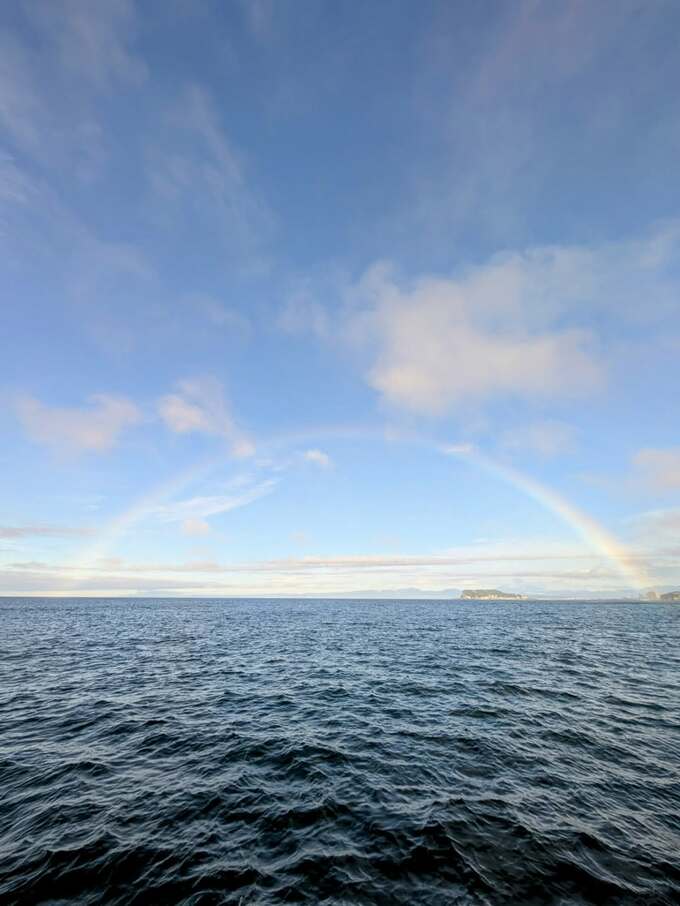 照英さんは、釣り船の甲板上で、釣り上げたマダコを見せながら満面の笑顔の写真を投稿。2枚目の写真では、大海原に大きな虹が両方の足元が見えるほどにハッキリとかかっていて、吉兆のように見えます。