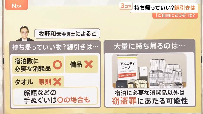 弁護士の牧野和夫氏によると、持ち帰っていい物は「宿泊数に必要な消耗品」で、例えば、小分けになっているものなどは持って帰っても大丈夫です。
