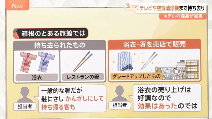 箱根のとある旅館ではこれまで、浴衣やレストランの箸などが持ち去られていました。担当者によると、「箸も高級なものではなく一般的な箸だが、かんざしにして持ち帰ってしまう客もいた」ということでした。