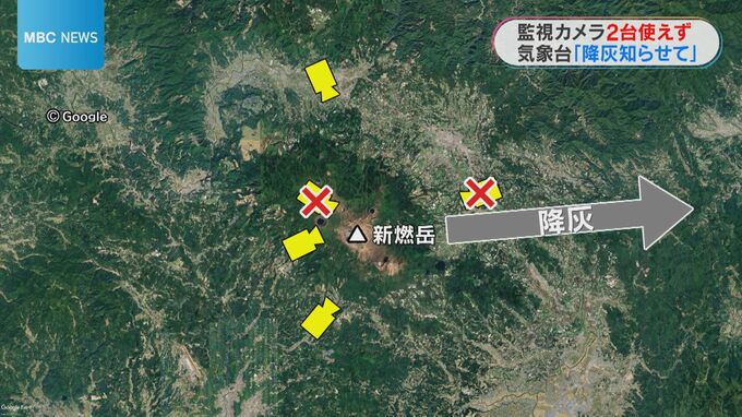 気象庁は、新燃岳の監視カメラを5台設置しています。しかしそのうちの2台は、システム障害で現在使用できません。22日の7年ぶりの噴火以降、灰は主に火口から東に流れていますが現在、監視カメラがないエリアです。