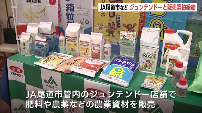 今回の契約は、去年9月にJA全農とジュンテンドーとで結んだ包括連携協定に基づいた内容です。JA尾道市管内のジュンテンドー店舗で、肥料や農薬などの農業資材を販売します。