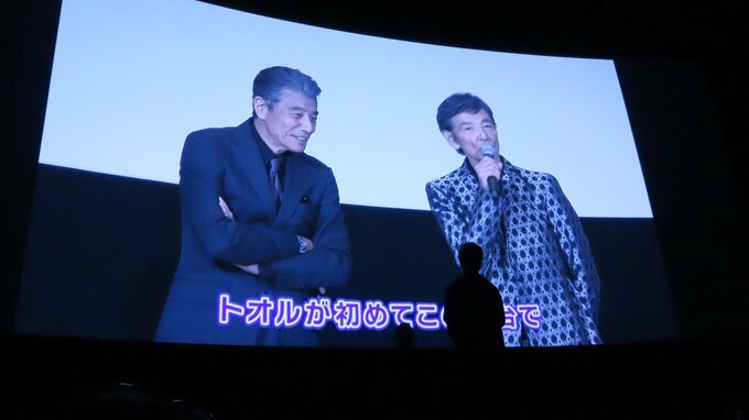 撮影での秘話を語り、イベントも終わったと思われた瞬間、会場が暗転し、サイレンが鳴ると「あぶない刑事」で共演した舘ひろしさんと柴田恭兵さんからのメッセージが登場。会場から驚きの声が上がりました。