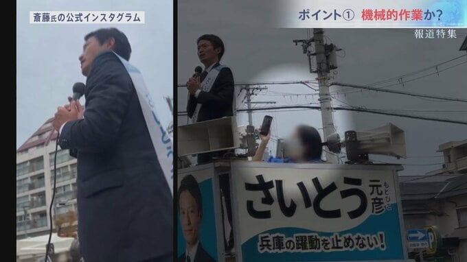 別の写真からは、スマートフォンで斎藤氏を撮影しているのがはっきりと確認できる。斎藤氏の公式SNSにアップされた映像とリンクさせると、カメラの動きや角度から、この公式映像はA氏のカメラが撮影したものだということがわかる。