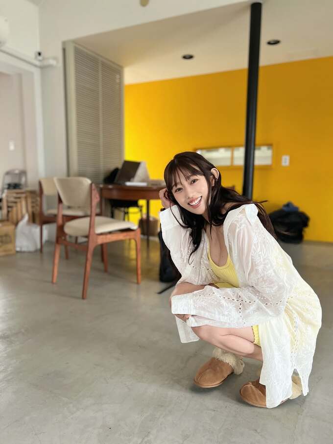 堀江聖夏さんは「オフショット このきいろのワンピースが 好評で嬉しいです」と綴ると、写真をアップ。