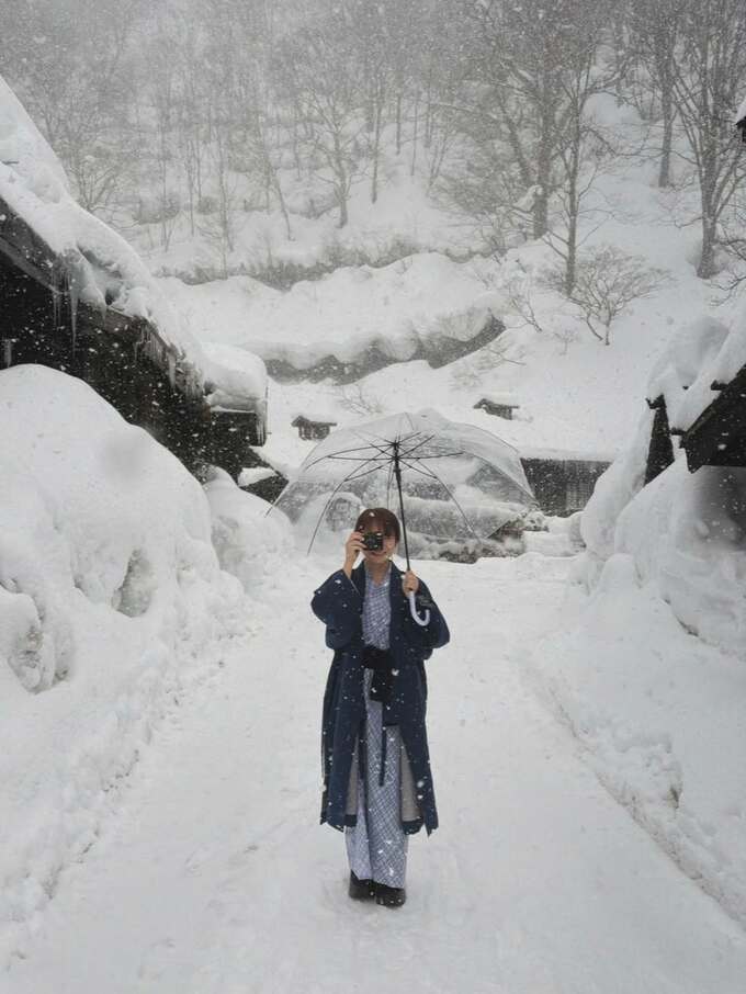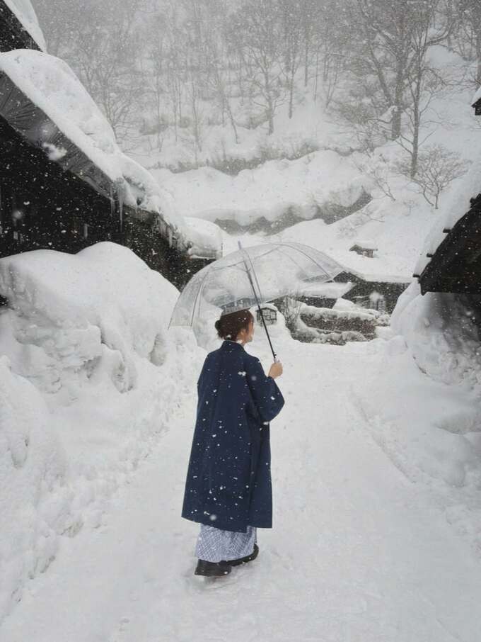 冬のシーンでは青いコートを身にまとい、透明な傘を持って雪道を歩く姿を披露しています。傘越しに見える雪景色は幻想的で、青いコートが白銀の世界に映える美しいコントラストを生み出しています。