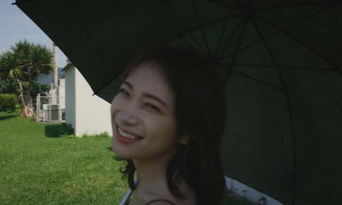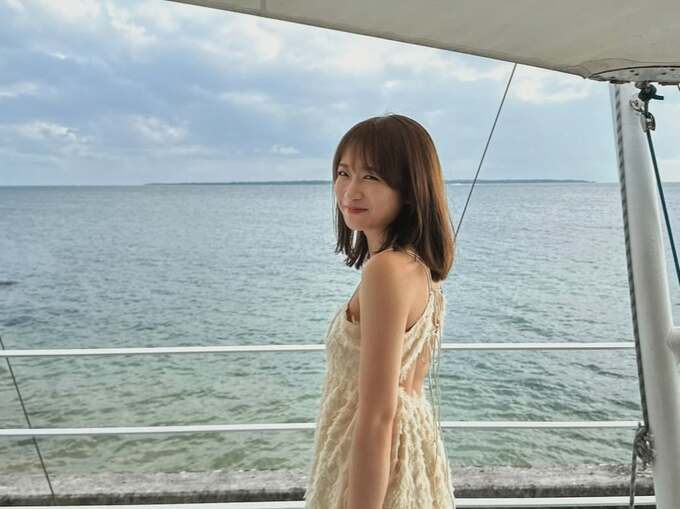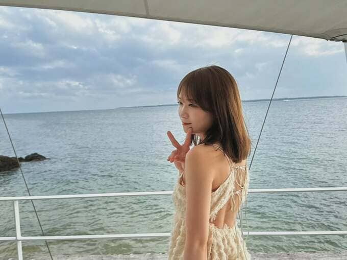 一方で、夏のシーンでは白いノースリーブのワンピースを着て海辺でカメラに向かってピースサインをする姿も投稿されています。背景には穏やかな青い海が広がり、柔らかな日差しが彼女を包み込んでいます。