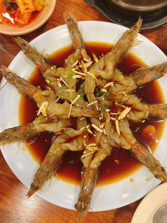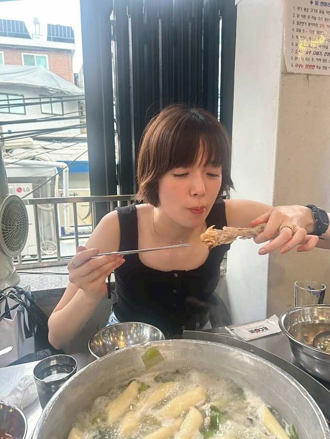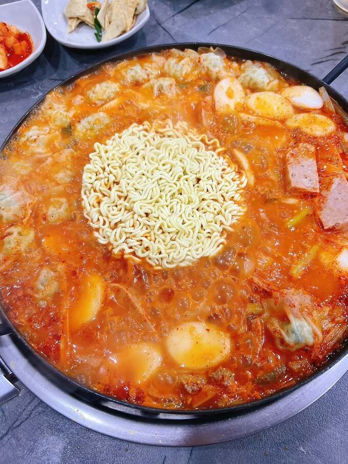 また、エビ料理や焼肉、トッポッキなどの韓国の定番料理も楽しんだようです。鍋料理の写真では、ぐつぐつと煮立ったスープの中にトッポッキやネギが浮かび、韓国の家庭料理の温かさが伝わってきます。