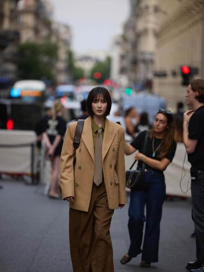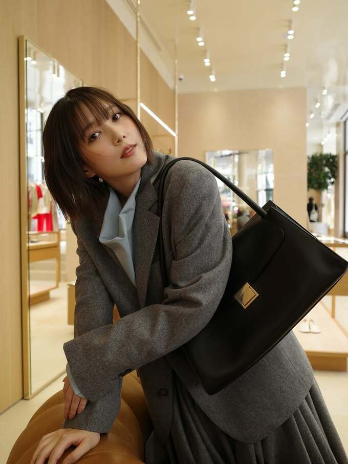 また、グレーのスーツジャケットに水色のシャツ、黒いハンドバッグを合わせたビジネスライクな装いなど、シーンに合わせた着こなしを披露しています。