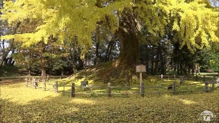 約2600本のサクラと1000本のカエデやモミジなどの紅葉が進み、秋の深まりを感じさせる弘前公園。こちらは「根上がりイチョウ」と呼ばれる、樹齢300年を超えるイチョウの木です。高さは約32メートルあり、その枝には黄色く色づいた葉が風に揺れています。またその周辺には落ち葉が絨毯のように広がっています。