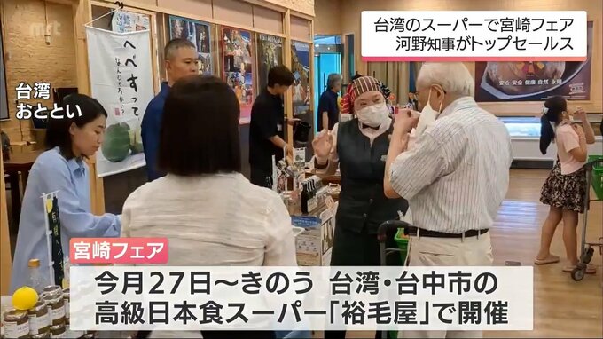 台湾で29日までの3日間、宮崎フェアが開かれました。河野知事も現地でトップセールスを行い、県産品をPRしました。今月27日から29日までの3日間、台湾・台中市の高級日本食スーパー「裕毛屋」で開かれた宮崎フェア…