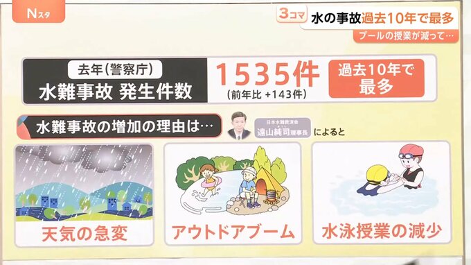 警察庁によると、2024年の水難事故は1535件(前年比+143件)だということです。これは過去10年で最多です。