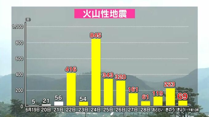 火山性地震は、先月24日の845回をピークに、きょう1日は午前10時までに69回と依然、多い状態が続いています。