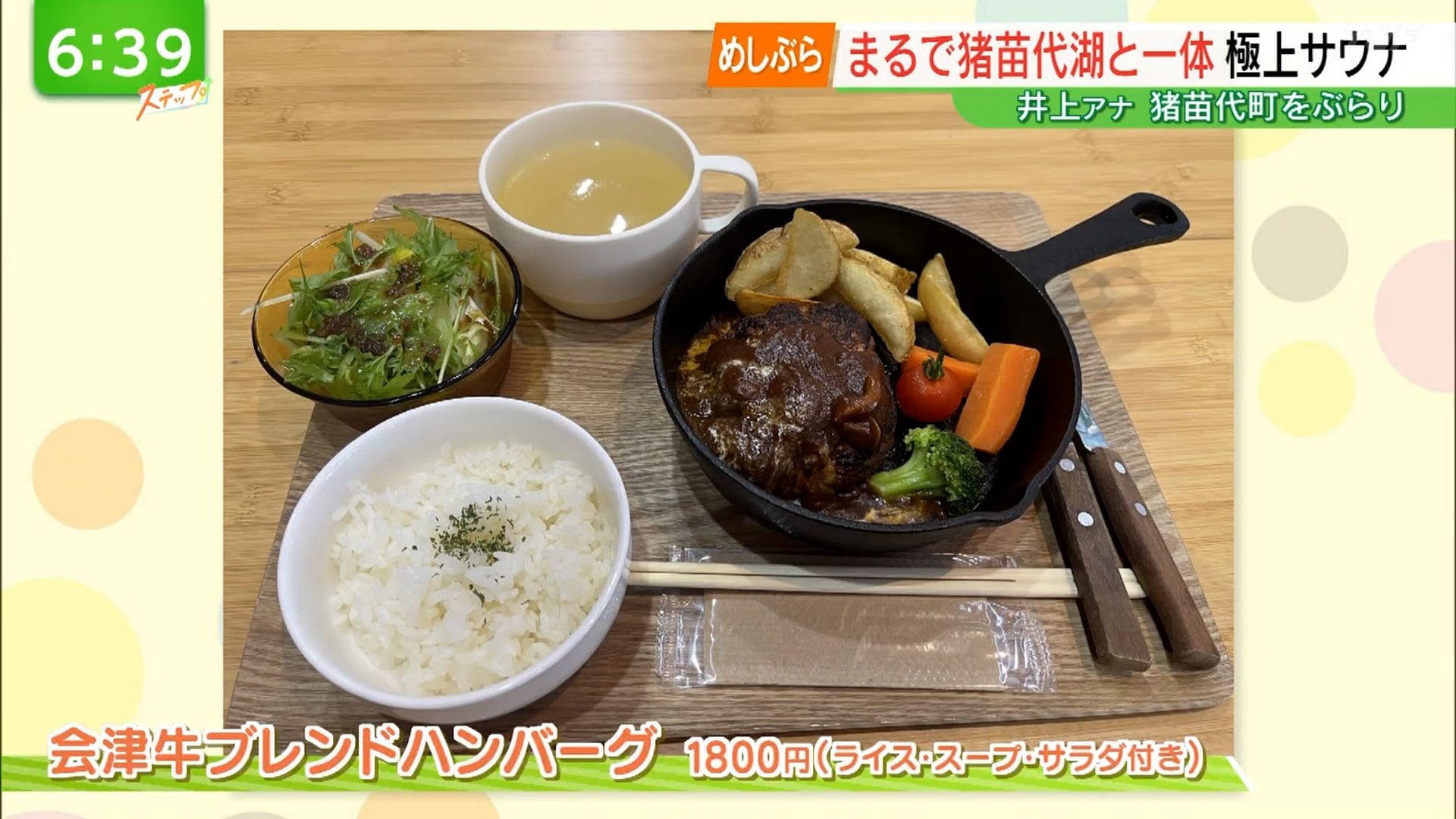 建物内にあるカフェ「FIKA」でサウナ飯を頂きます。今回井上アナが選んだのは「会津牛ブレンドハンバーグ(1800円/ライス・スープ・サラダ付き)」です。